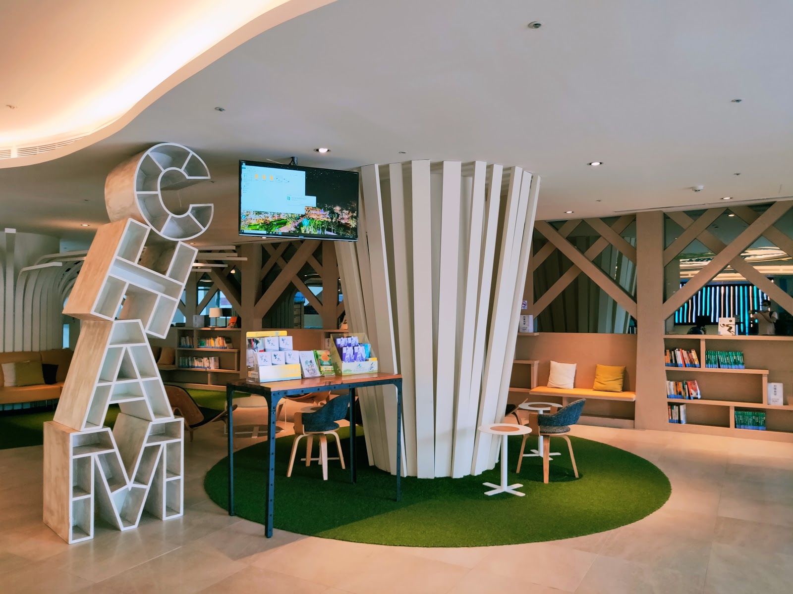 那紅色的屋瓦白色的牆面襯在藍天群山之中,一整個渡假的味道就出來了,進入大廳之後,就可以發現凱撒飯店很用心的將原本的山芙蓉渡假大酒店轉化成當下活力、年輕、色彩十足的趣淘漫旅-台南,要說Hotel Cham Cham是個親子飯店一點也不為過,開闊的大廳,有著圓形吊椅,有著一整排的閱讀空間,還有一個親子互動區域(需脫鞋),加上一個旅客休憩閒聊場所,雖然大廳十分寬廣,但卻一點也不無聊。